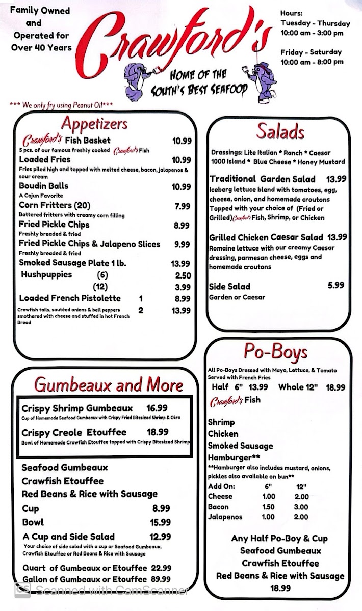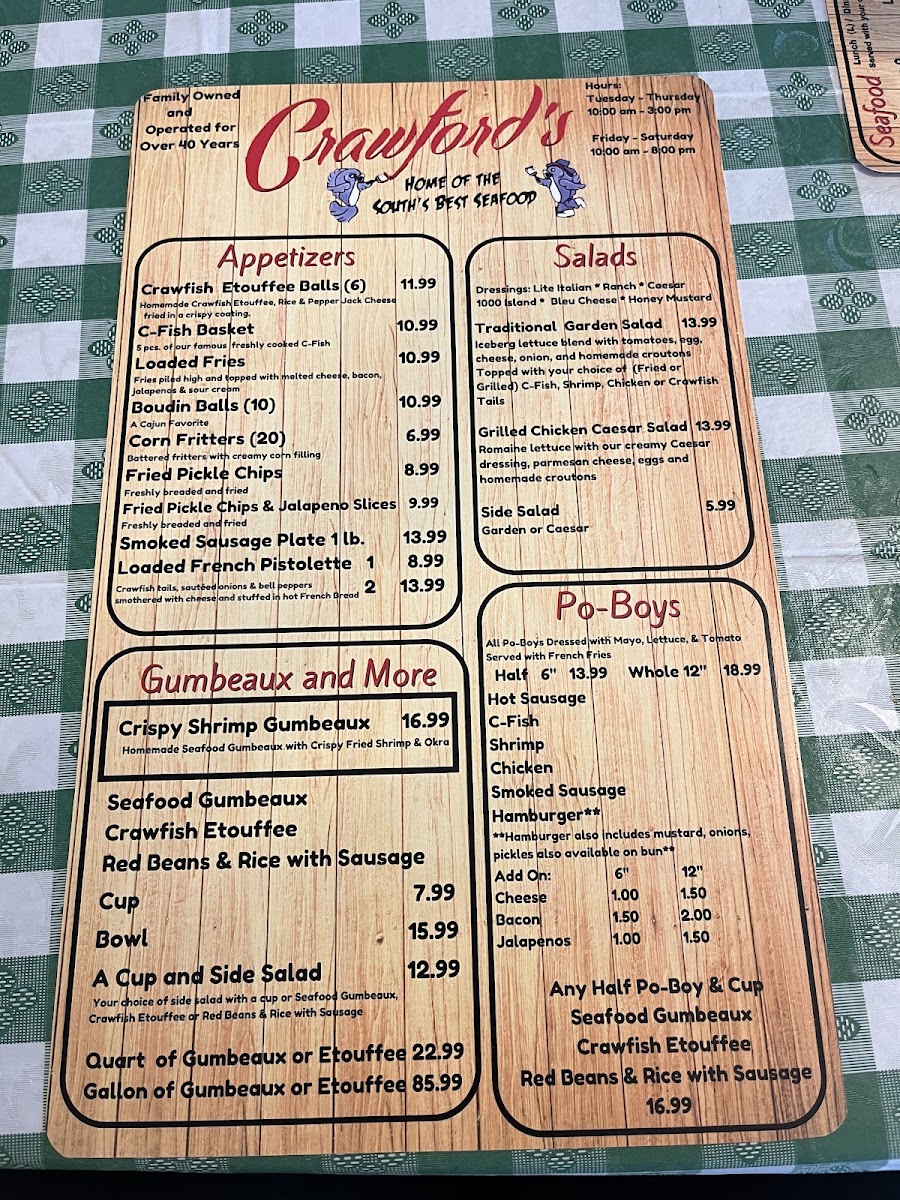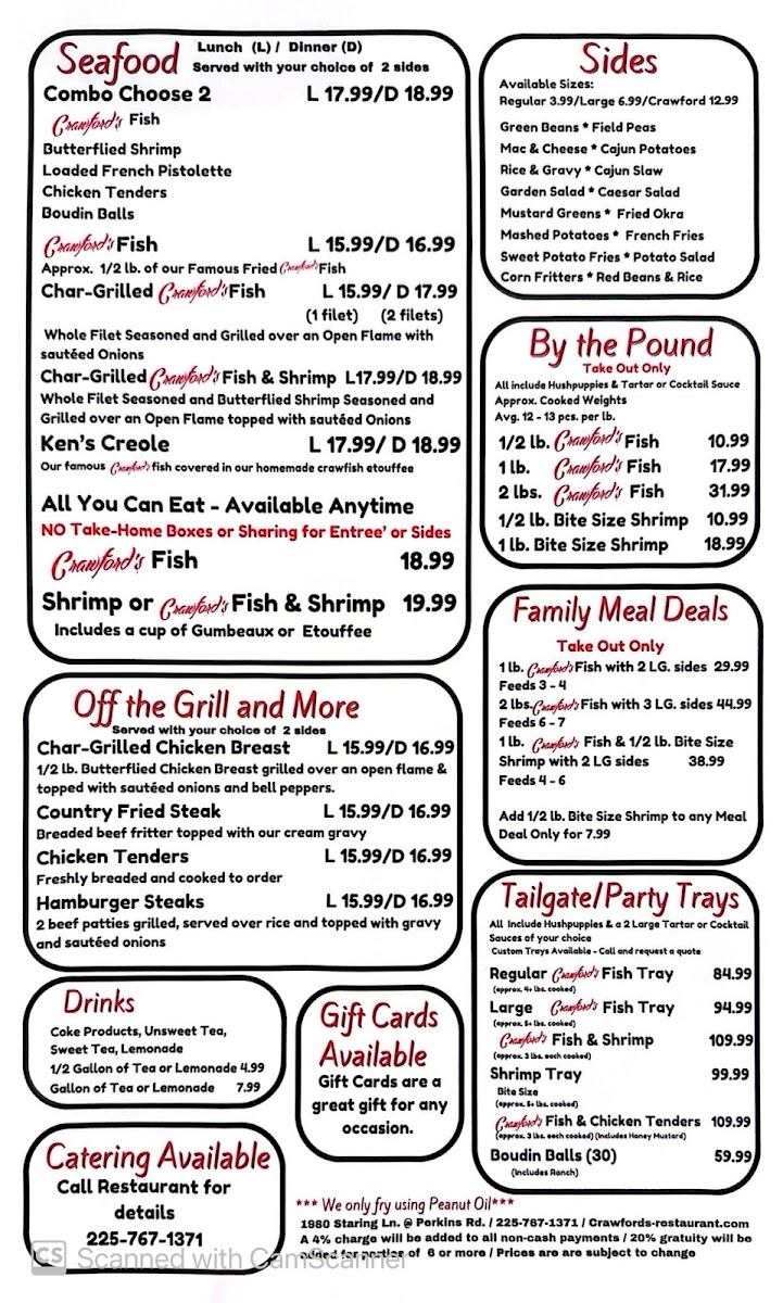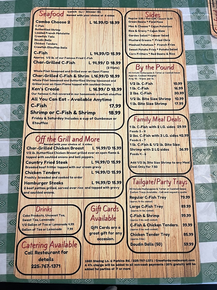 At Crawford's Restaurant, located at 1980 Staring Ln, Baton Rouge, LA, diners can expect a delightful selection of dishes that showcase both comfort and creativity. The menu brings together classic flavors and innovative twists, offering everything from hearty mains to light, flavorful sides. Whether you're in the mood for a juicy steak, fresh seafood, or a savory pasta dish, there’s something to satisfy every craving. Each item is crafted with care, using quality ingredients that promise to elevate your dining experience. The Crawford's Restaurant Menu is a perfect balance of familiar favorites and exciting new options, making it a go-to spot for both regulars and first-timers.