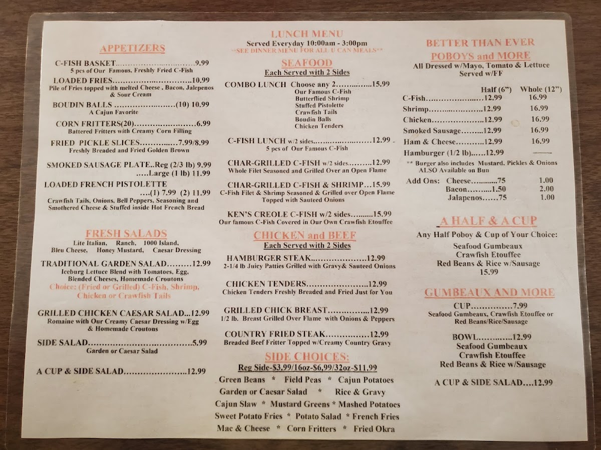Your choice of side salad with a cup of Seafood Gumbeaux, Crawfish Etouffee or Red Beans & Rice with Sausage